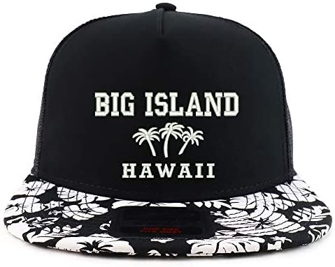 Trendy Apparel Shop Big Island Hawaii Embroidered Floral Bill Mesh Snapback Cap. 100% Cotton , 100% Polyester Mesh Back. High quality Hawaii theme baseball cap, 100% Embroidered in USA. 5 panels, high profile, front structured crown with 4 mesh back panels. Stiff and flat bill, floral printed bill, matching printed under bill. Finished with an adjustable plastic snapback closure. One size fits most.