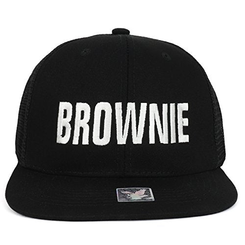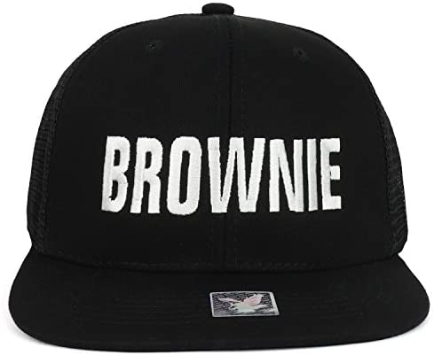 Our Brownie Embroidered Cotton Flat Bill Mesh Cap is great for any occasion. Made of 100% Cotton. Front constructed crown with 4 mesh back panels. 6 Panel High Profile, Hard Buckram, Constructed Cap. Embroidered Eyelets and Mesh Back Panels for Enhanced Breathability . Adjustable plastic snap closure. One Size Fits Most.