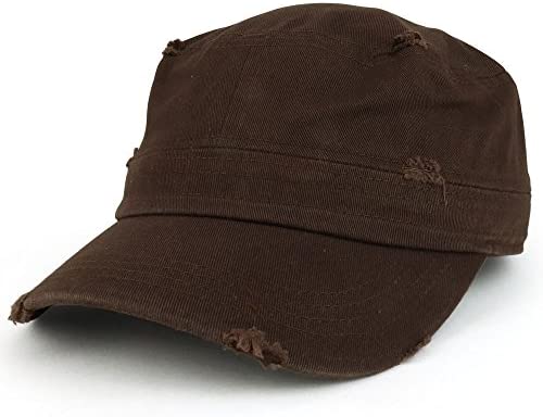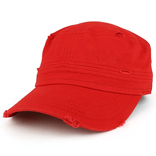 Our Frayed Vintage Flat Top Style Castro Army Cap is a great look for any occasion. Made of 100% Cotton. Flat Top Army Cap. Hook and Loop Enclosure. Adjustable size. Ensures a comfortable fit. One size fits most.