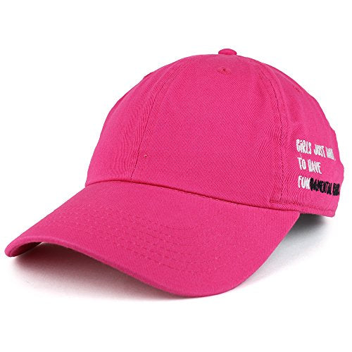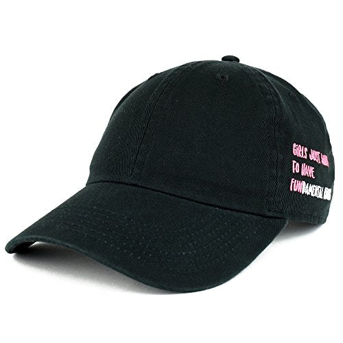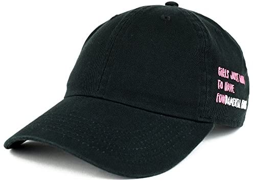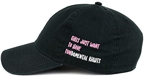 Our Girls Want to Have Fundamental Rights Embroidered Unstructured Cotton Cap is a unique and stylish hat for ladies. This comfortable and flexible dad hat features high quality embroidered text on the side. Made of 100% Cotton. Stiff and pre curved bill. Low profile. Unstructured hat. 6 ventilation eyelets. Fitted with an inner cotton hatband. Fitted with an adjustable metal strap closure. One size fits most.