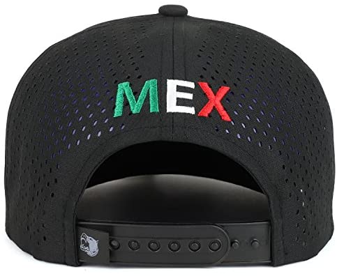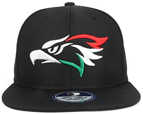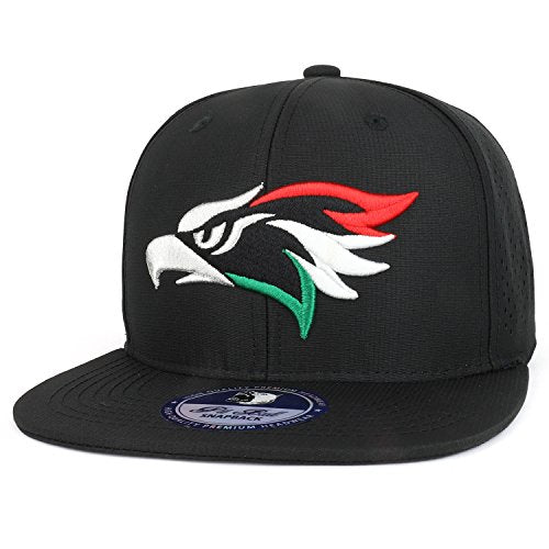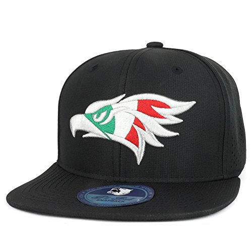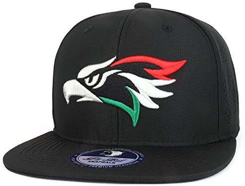 Our Trendy Apparel Shop Hecho En Mexico Eagle 3D Embroidered Flat Bill Punching Mesh Snapback Cap is a perfect hat to represent Mexican pride and culture . Made of 100% Polyester. Front 2 panels with 4 mesh back panels. Structured front crown. 6 panels. Stiff and flat bill. Adjustable plastic snapback closure, MEX is embroidered on the back. One size fits most.
