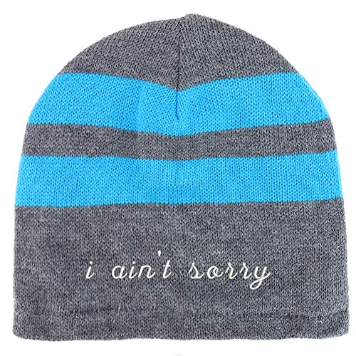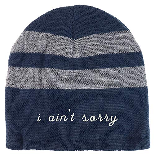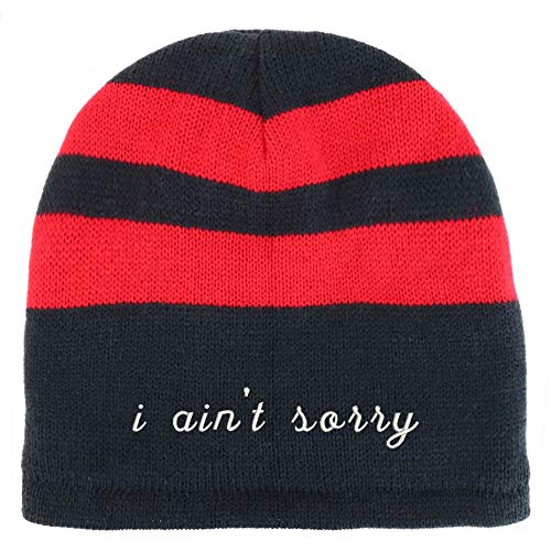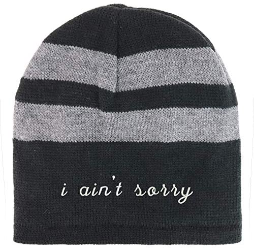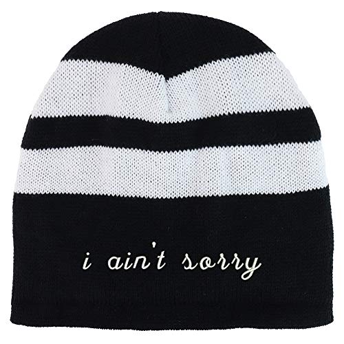 Trendy Apparel Shop I Ain't Sorry Embroidered Fleece Lined Striped Short Beanie. 100% Acrylic . Stripe patterned winter beanie hat for everyone . Fully fleece lined inside for added warmth and comfort . Beanie measures around 9.5 inches wide and 8.5 inches deep. Easily stretchable, ensuring a comfortable fit for most head types. One size fits most with flexibility .