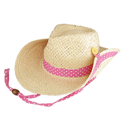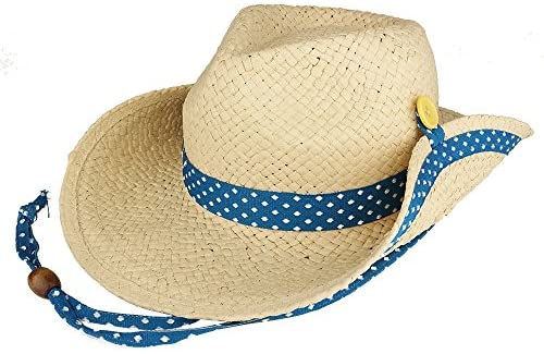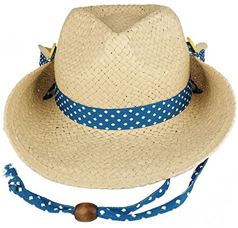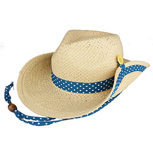 Our cool and versatile Kid's Roll Up Brim Straw Cowboy Hat with Dotted Band is a great summer hat for your little ones. This youth size straw cowboy hat is accented with a dotted hat band and chin cord. Made of 100% Paper Straw. Crushed top crown. Rolled up side brim. Fitted with an adjustable chin cord. One size fits most kids.
