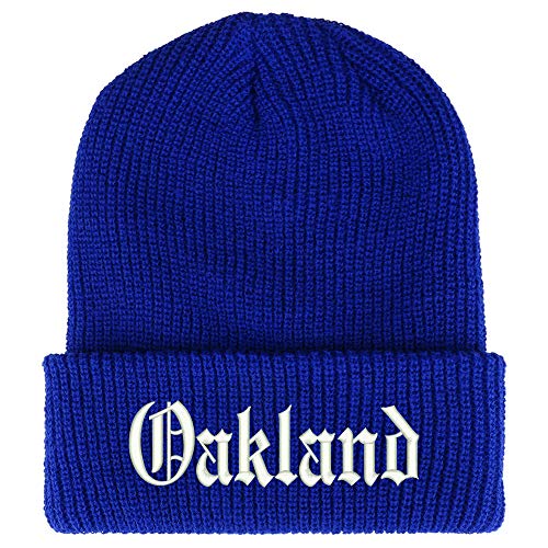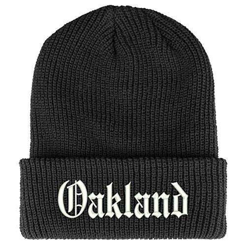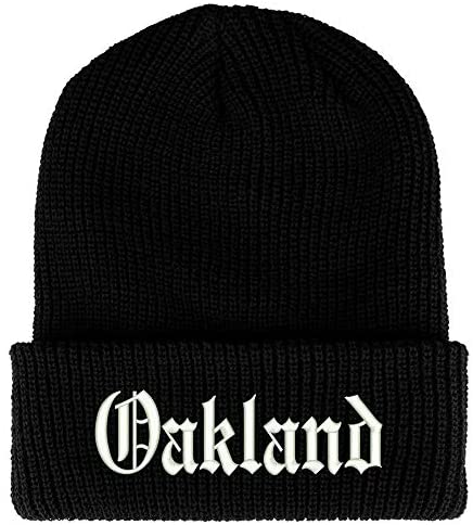 100% Acrylic. Old English Font Oakland City Embroidered Ribbed Cuff Knit Beanie. High Quality Beanie. Embroidered in the USA. Handwashable. Hypoallergenic Acrylic Material. Uncuffed length Measures about 10 inches. Easily Stretchable, ensures a comfortable fit. One Size Fits Most.