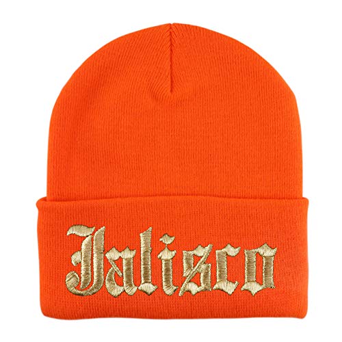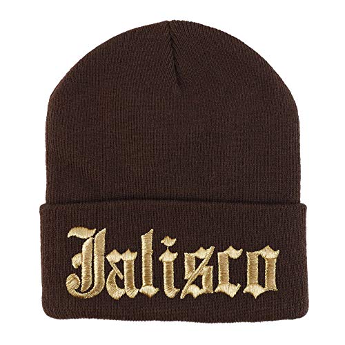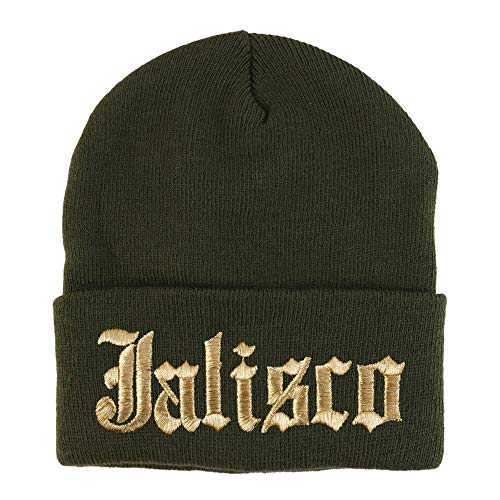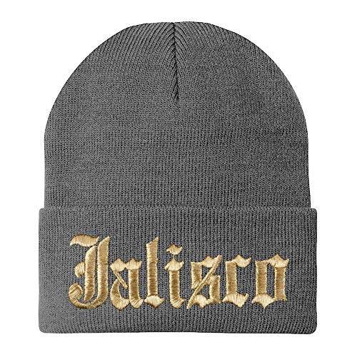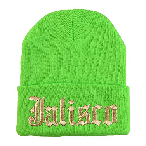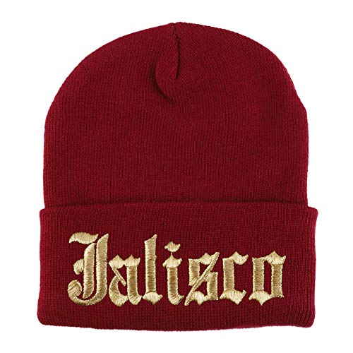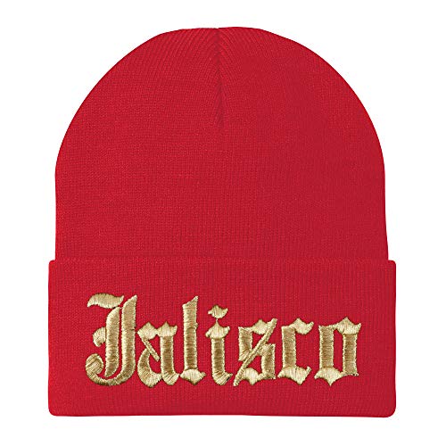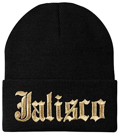 One size fits most winter acrylic beanie, stretches to fit most people.Embroidered in USA with gold thread to highlight old english font design. Long cuff style beanie, crown measures 12 inches deep.Manufactured from Bangladesh. Design embroidered in US.Comfortable acrylic knit beanies are perfect for chilly winter mornings. Show off your Mexican heritage!