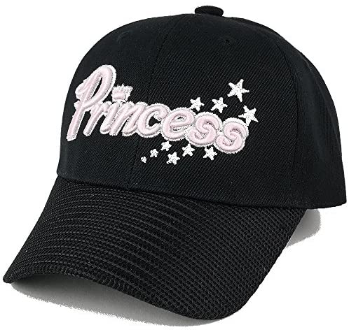 This Princess Text Embroidered Kids size adjustable baseball cap is perfect for your little ones. This hat would make a great gift. Princess embroidered text on the rear strap and the front includes text with stars over. This cap comes with a fashionable trendy mesh look like on the top side of the bill. One size fits most kids.