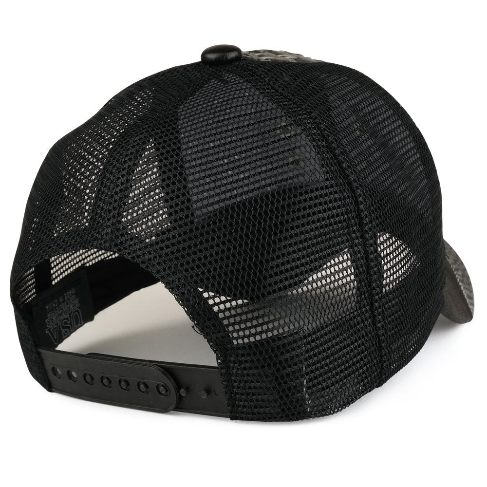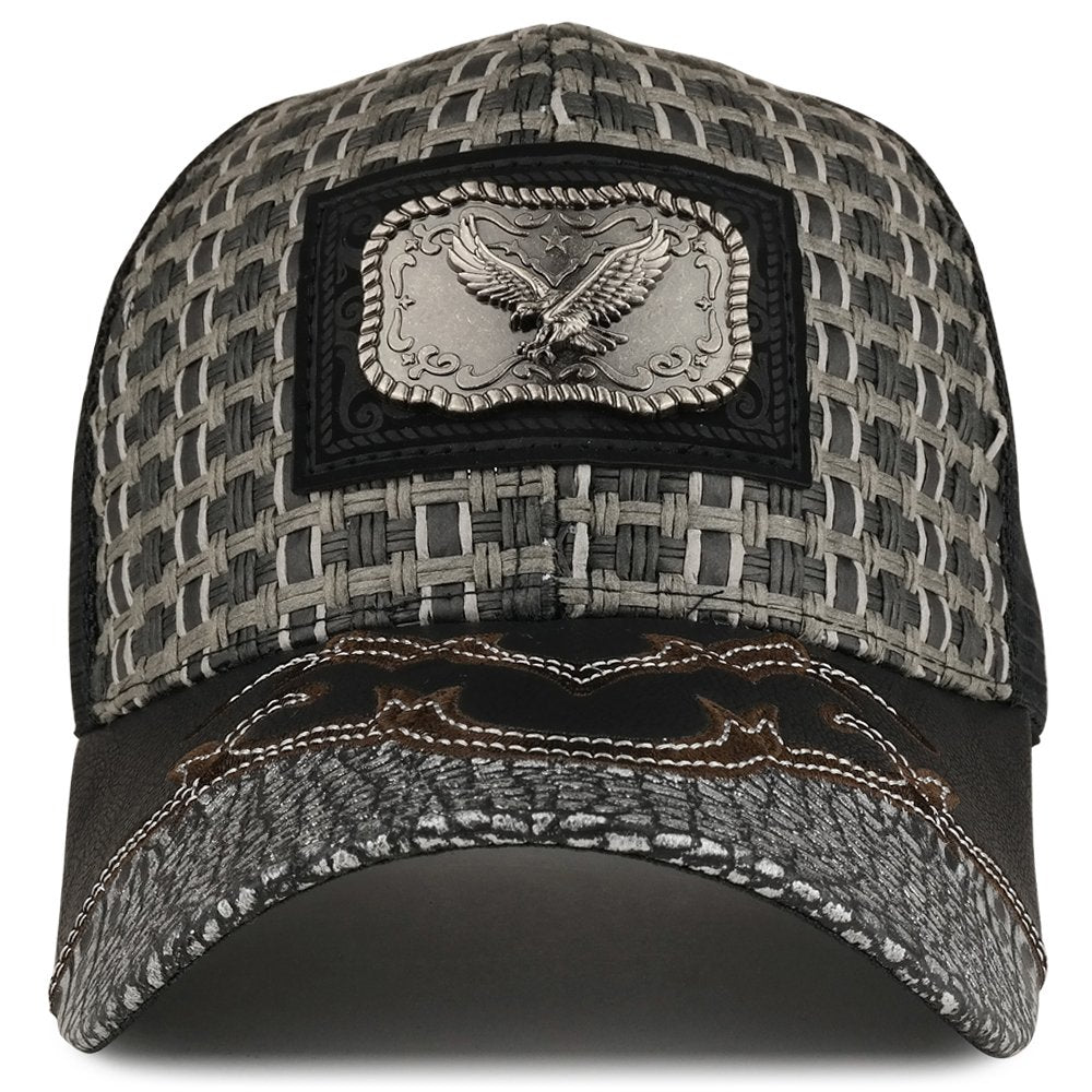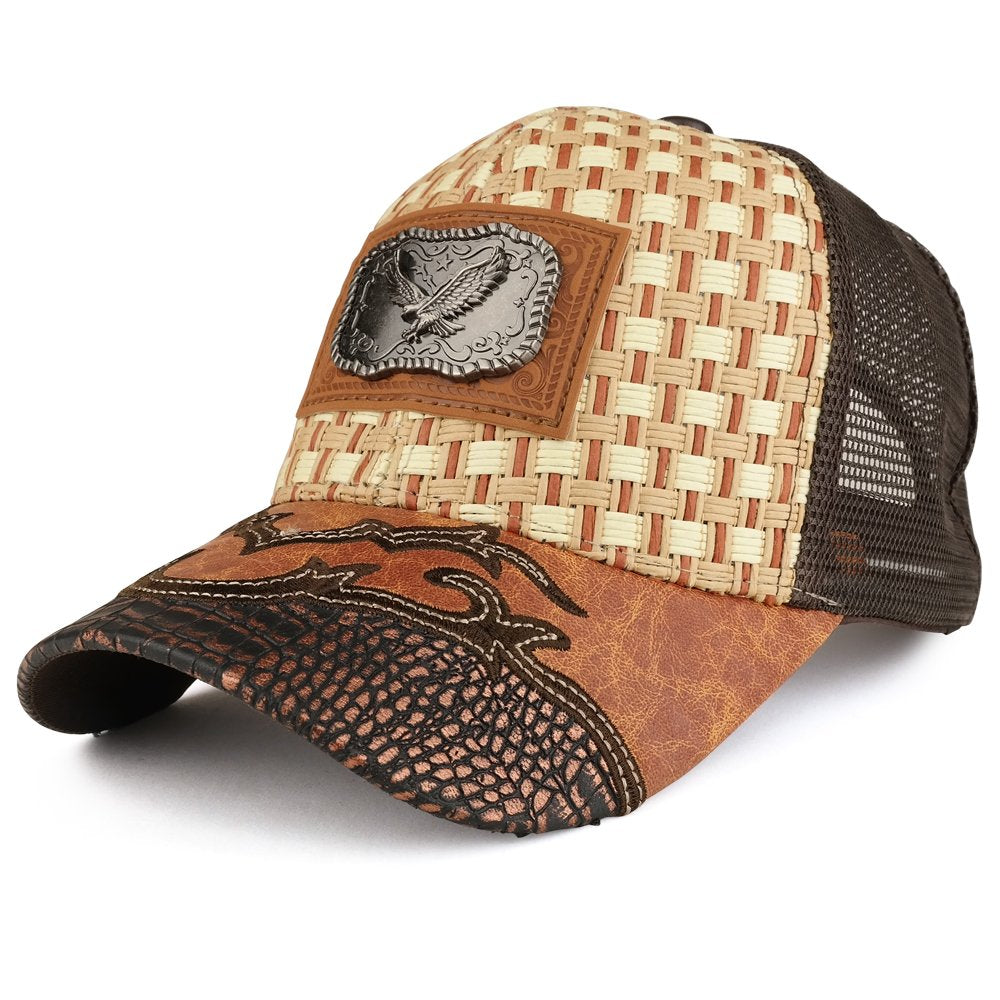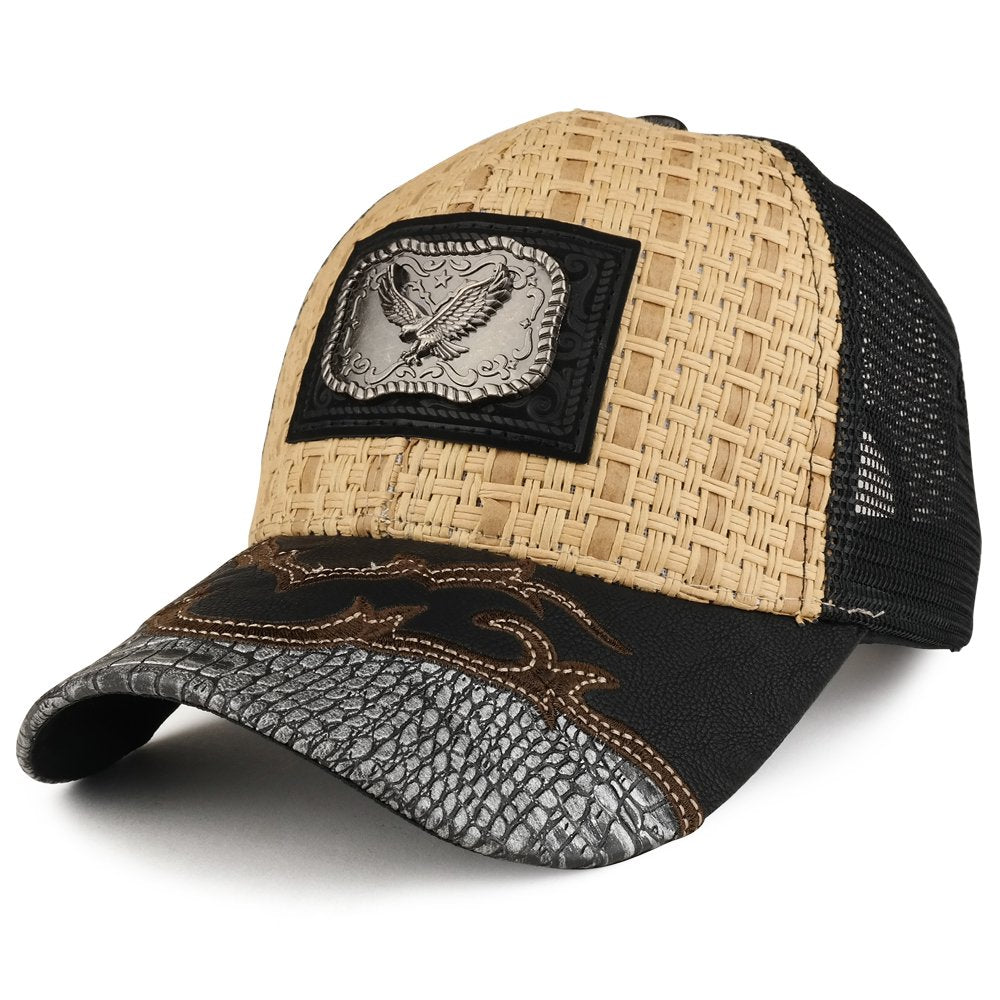 Our Straw Design Metallic Eagle Logo Trucker Mesh Adjustable Baseball Cap is a perfect hat for any outdoor occasion. Metal Plate over embroidered PU leather style patch to match the bill style. One size fits all. 100% Polyester. Straw design on front crown. Adjustable snapback closure. Available in 4 PU leather styles; snake, crocodile, black and orange.