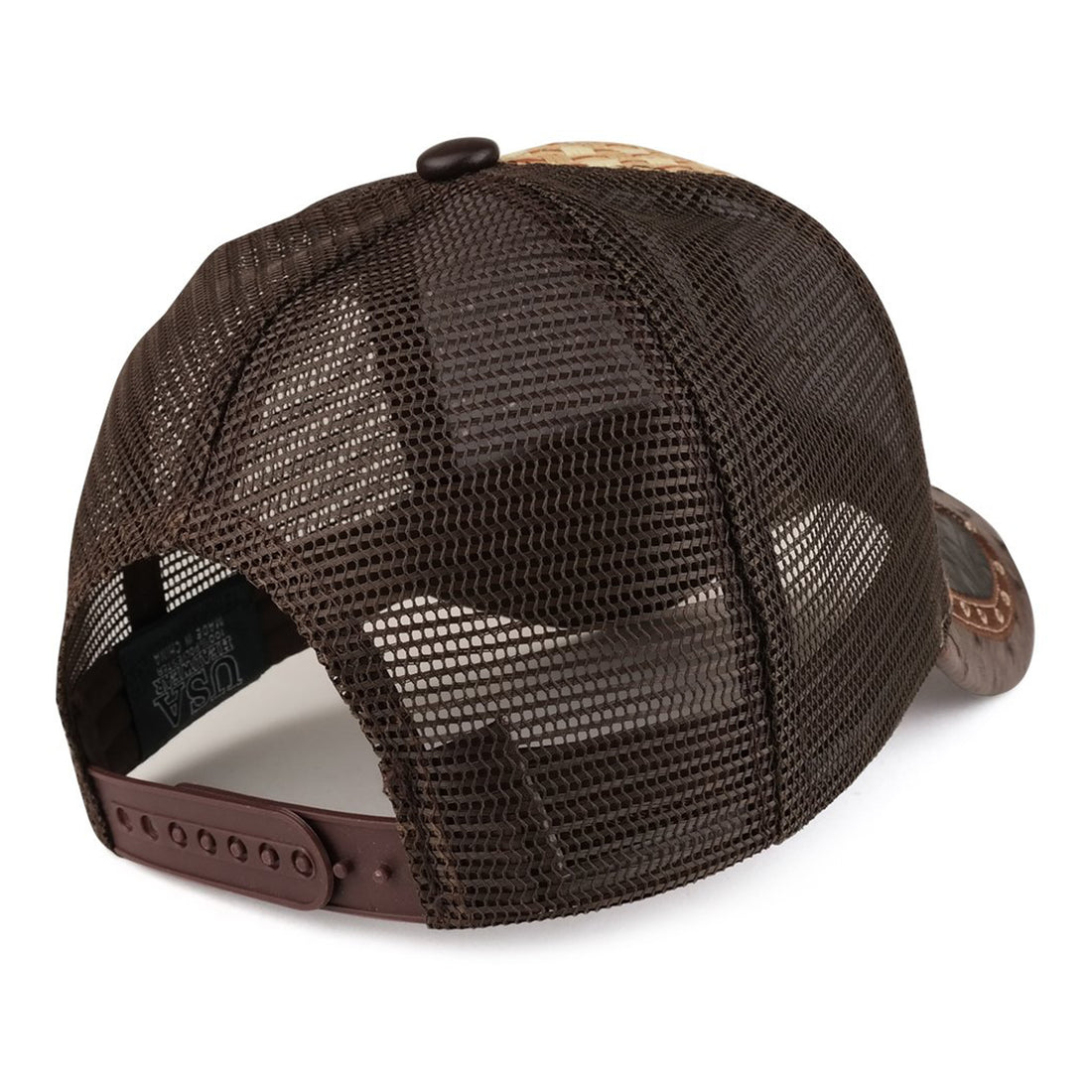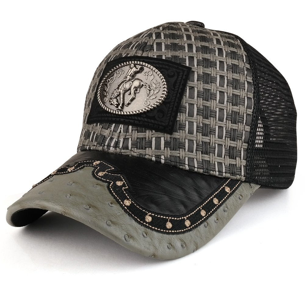 Our Straw Design Metallic Rodeo Cowboy Horse Metal Logo Trucker Mesh Baseball Cap is a perfect hat for any outdoor occasion. Metal Plate over embroidered PU leather style patch to match the bill style. One size fits all. 100% Polyester. Straw design on front crown. Adjustable snapback closure. Available in 4 PU leather styles; snake, crocodile, black and orange.