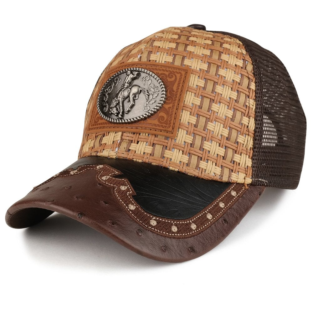 Trendy Apparel Shop Straw Design Metallic Rodeo Cowboy Horse Metal Logo Trucker Mesh Baseball Cap