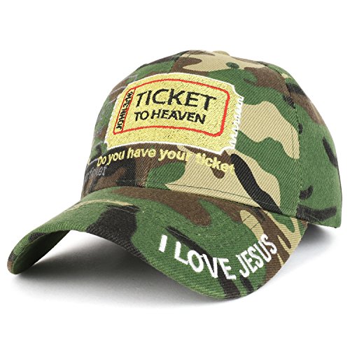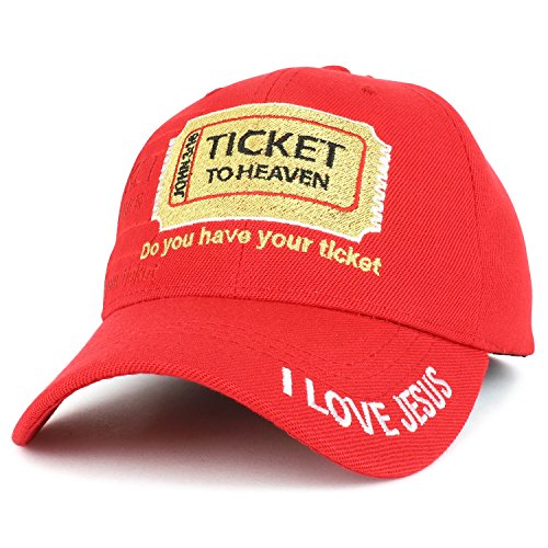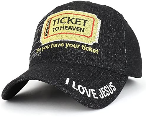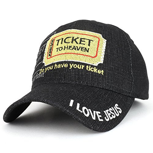 Our Trendy Apparel Shop Ticket to Heaven Jesus Embroidered Christian Theme Baseball Cap is great for those looking for Christian themed religious hat. This structured baseball cap is embroidered with golden sparkle ticket of JOHN 3:18 Ticket to Heaven on the front. Made of 50% Acrylic and 50% Cotton. Stiff and pre-curved bill, I LOVE JESUS is embroidered on the side of bill. Mid profile. Structured crown. 6 panels. 6 small ventilation eyelets. Adjustable hook and loop closure, JESUS printed back strap. One size fits most.