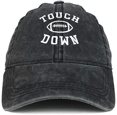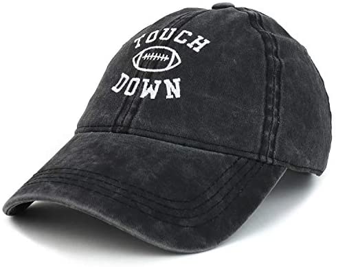 Trendy Apparel Shop Touch Down Football Embroidered Washed Cotton Baseball Cap. 100% Cotton. TOUCH DOWN football is embroidered on the front. 6 panels, low profile, unstructured crown. Stiff and pre-curved bill, same color under bill. Finished with an adjustable metal buckle strap closure. One size fits most.