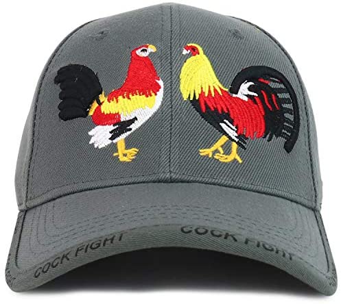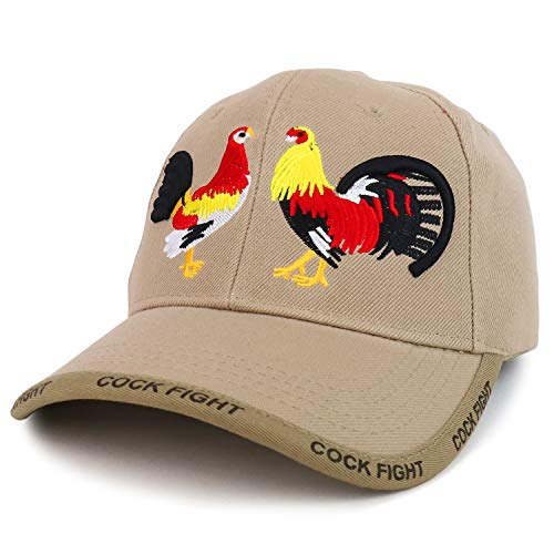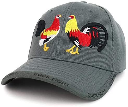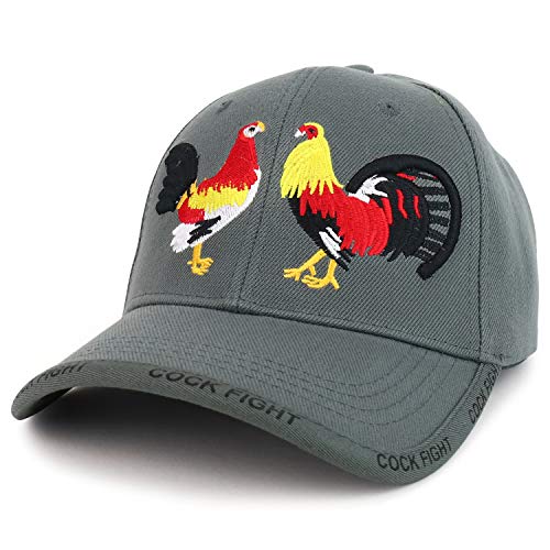 Trendy Apparel Shop Two Roosters Embroidered Cock Fight Structured Ball Cap. 100% Polyester. Design of 2 roosters is embroidered on the front. 6 panels, mid profile, structured and firm crown. Stiff and pre-curved bill, cock fight is printed around the edge of bill, matching under bill. Finished with an adjustable hook and loop closure, COCK FIGHT is embroidered on the back. One size fits most.
