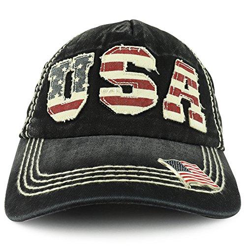 Trendy Apparel Shop Vintage Frayed USA Patch 5-Panel Washed Cap with Metallic USA Flag Pin - Black