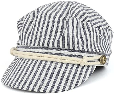 Our Trendy Apparel Shop Women's Greek Sailor Pinstriped Cotton Baker Boy Hat is a stylish outdoor hat for ladies. This pinstriped fiddler hat is accented with a white rope band around the front crown. Made of 100% Cotton. Flexible and soft crown. Fitted with an inner sweatband. Fully lined inside. Stiff and pre-curved bill, bill measures 2.3 inches long. Finished with an adjustable clip on the back. One size fits most, fitting up to 57CM.